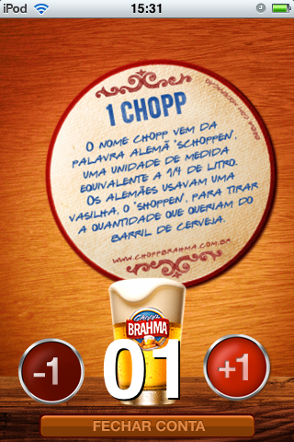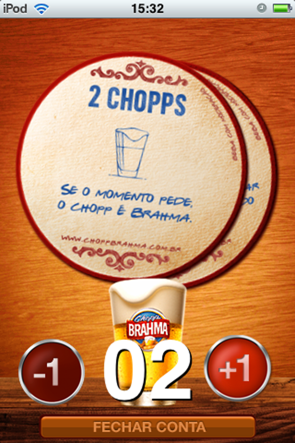 Usar o Choppômetro Brahma é muito fácil. Abra o programa e a cada choppinho pedido, toque em +1. Uma bolacha de copo marca a sequência e ainda mostra curiosidades sobre a história da cerveja.